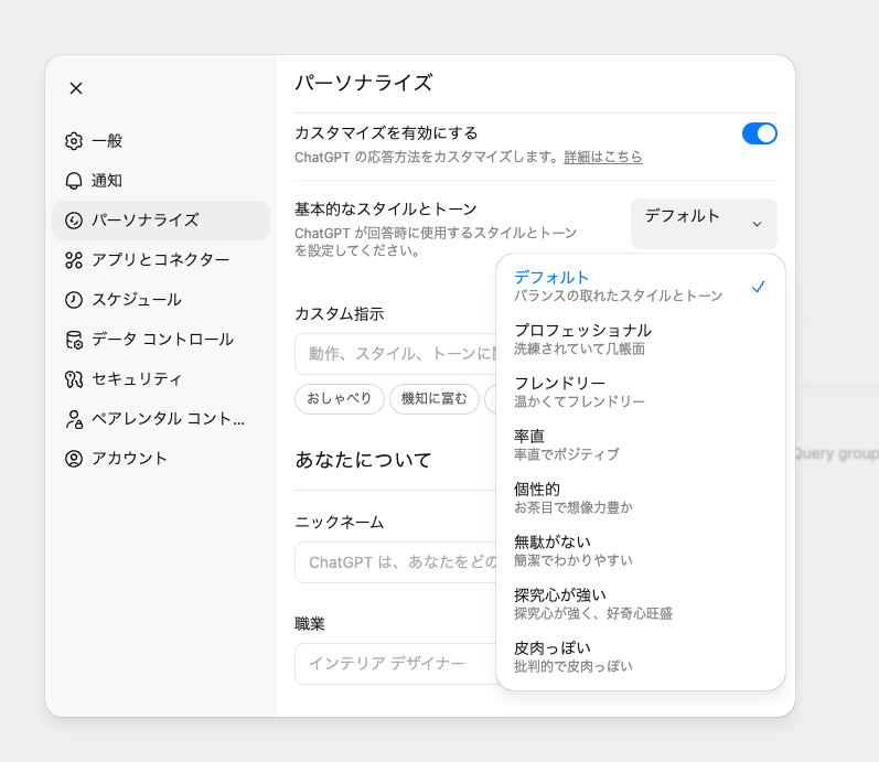 • 会話スタイルの選択肢に「プロフェッショナル」「率直」「個性的」が新しく追加