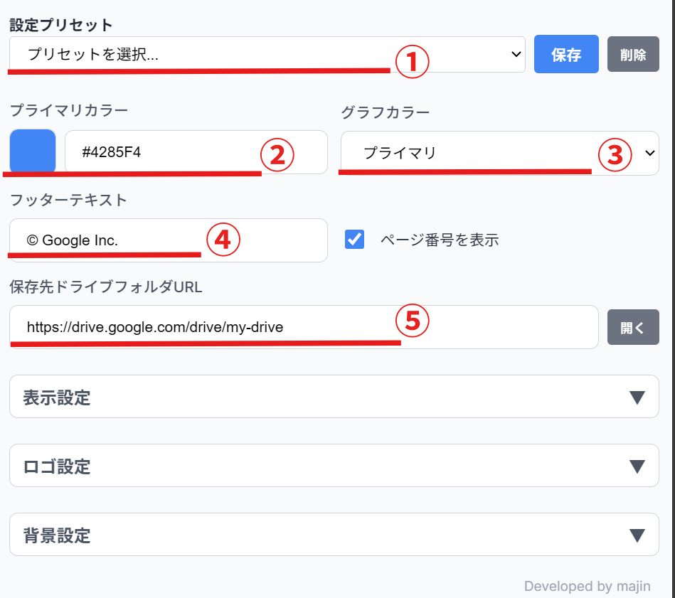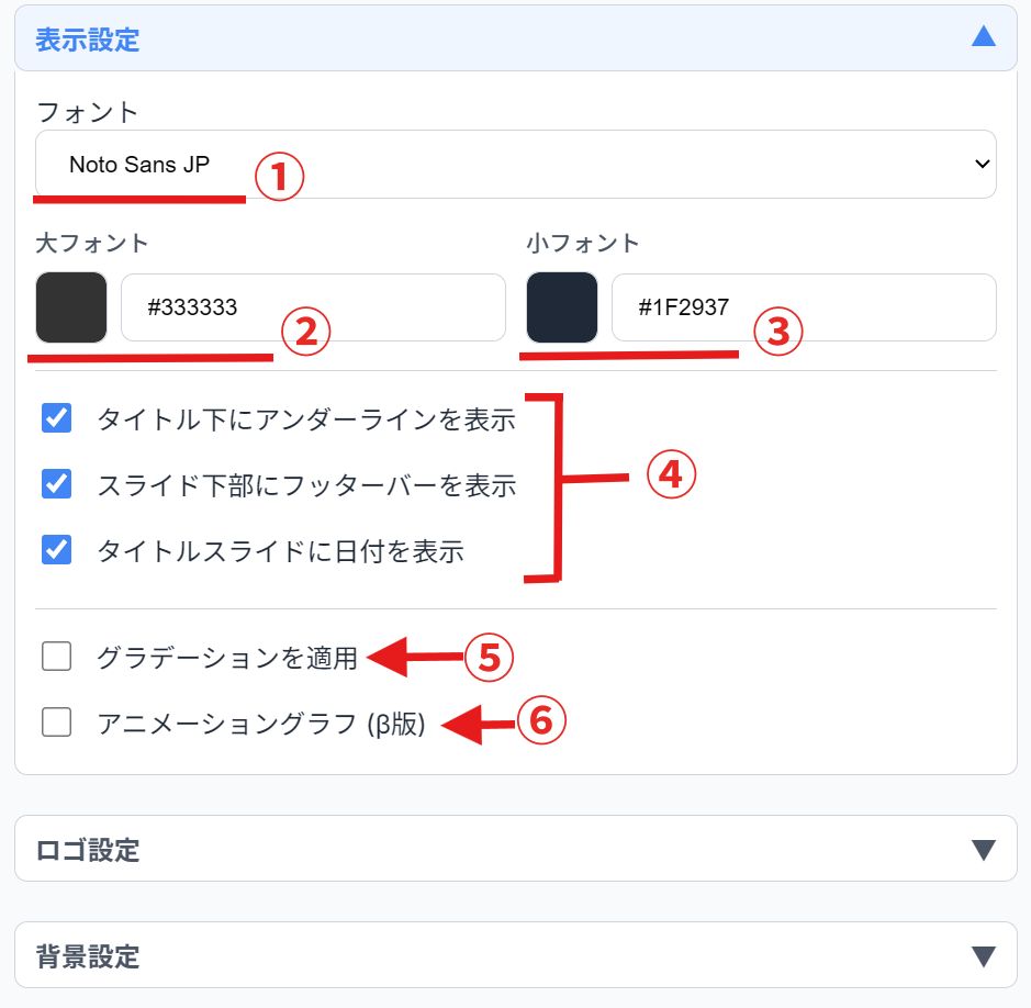 ⑤:文章や内容が書かれた各メインスライドの背景を設定できます。