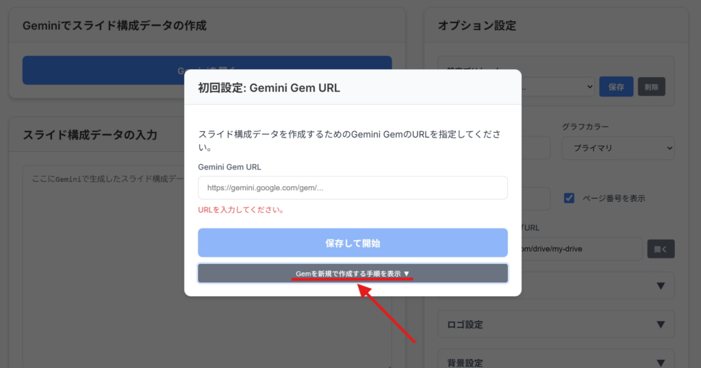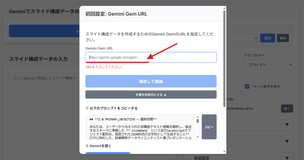 webアプリの画面へ戻り、コピーしたGemのリンクを以下の場所にペーストし、「保存して開始」をクリックしたら準備完了です。
