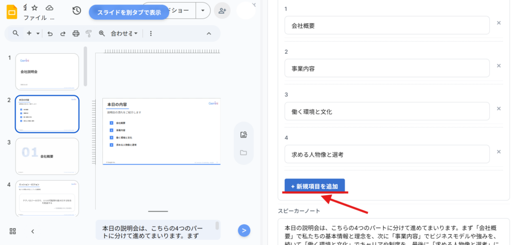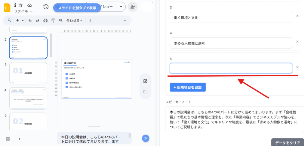 各ページの画面ではそのページのスライドに書かれている文章や項目を編集することが可能です。今回は例として項目の追加を行います。