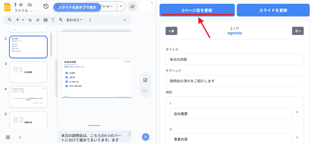 追加した項目に表示させたい内容を入力したら最後にスライドを更新します。今回は2ページ目を編集したので、編集画面1番上の「2ページ目を更新」をクリックします。