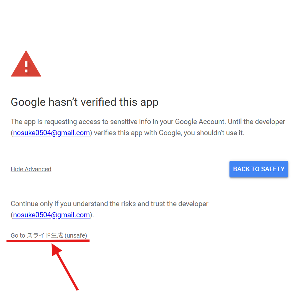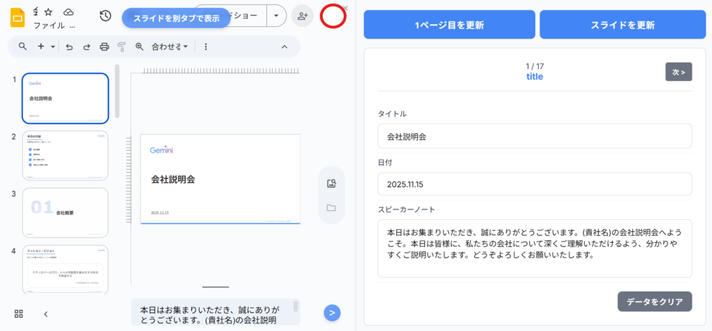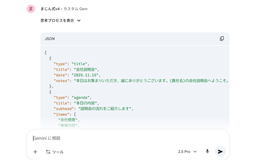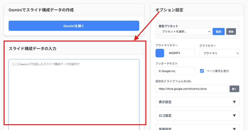 先ほど作ったGASアプリを開き、「スライド構成データの入力」という箇所にGemで生成されたコードをコピペします。