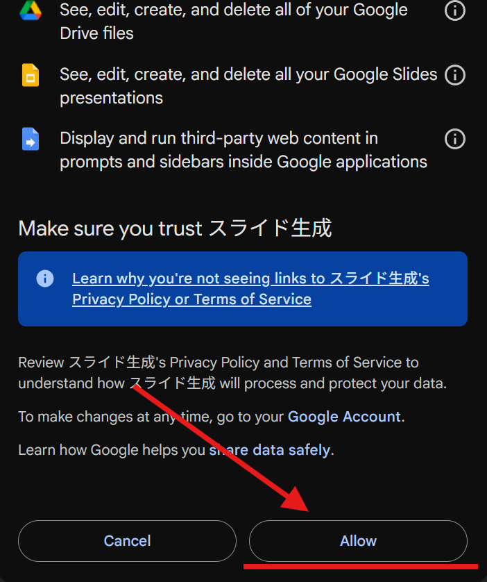 次のような画面になるので一番下の「Allow」を押します。するとwebアプリのURLが表示され、そこからアプリにアクセスできます。