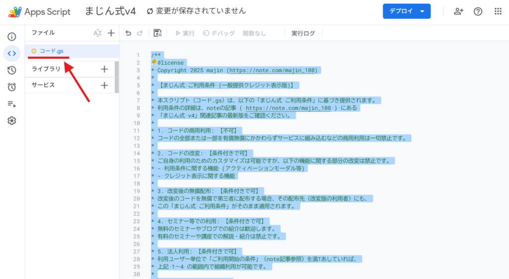 ・コード.gsには「コード.gs.txt」をコピペし上部バーの保存ボタンを押す。