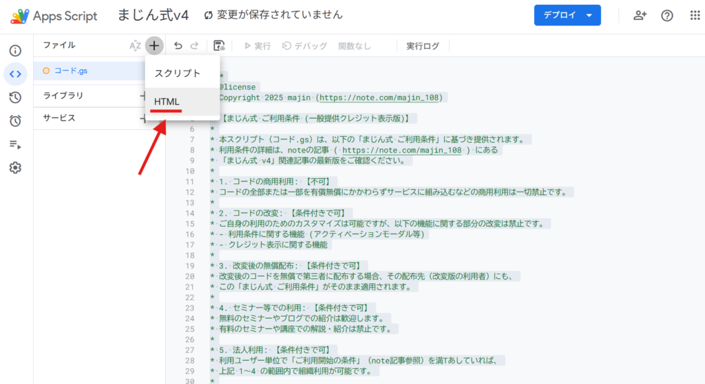 ・左上の+ボタンからHTMLを追加し、「無題.html.txt」をコピペする。(HTMLコードのファイル名はデフォルトの「無題」のままで大丈夫です)