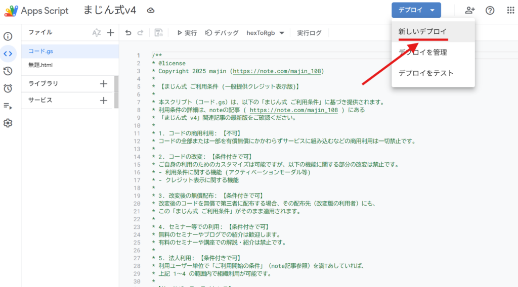 右上の「デプロイ」ボタンから「新しいデプロイ」を押し、スクリプトをデプロイします。