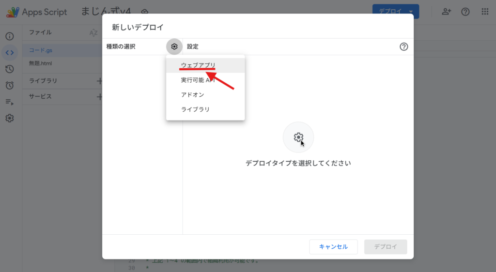 次に「デプロイタイプを有効にする」で「ウェブアプリ」を選択し、「デプロイ」をクリックします。