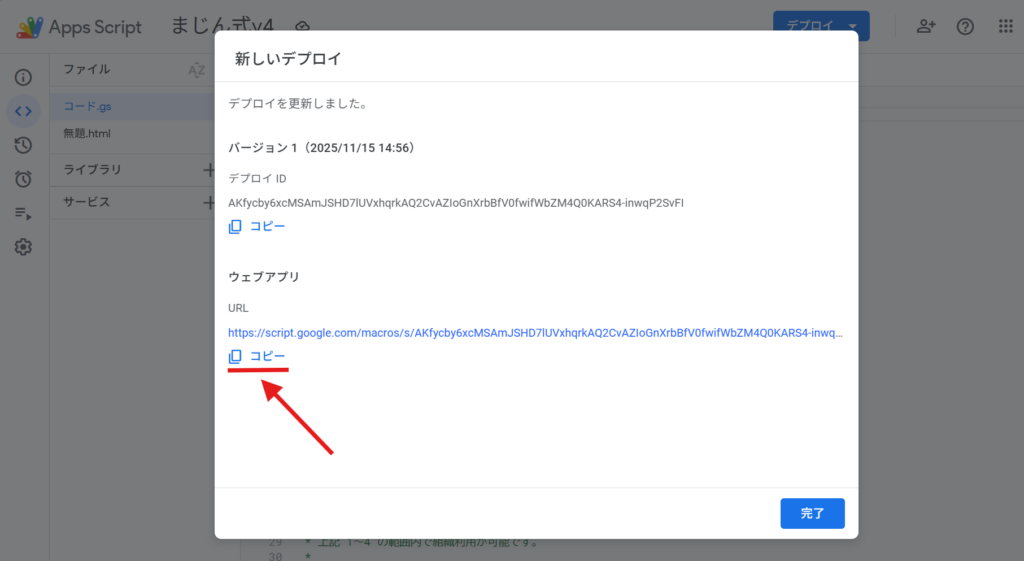 すると以下のような完了画面になり、webアプリのURLが表示されるのでそこをコピーし検索バーに貼り付けるか、選択すると開くことができます。