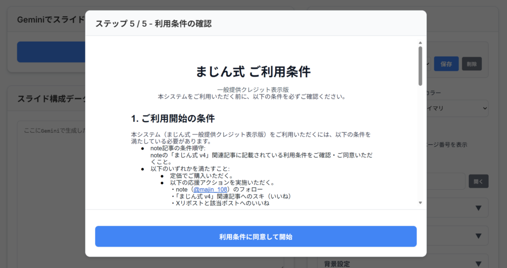 - 無料版で生成されたスライドには、拡散目的のクレジット(©まじん式)が表示されます(編集画面で削除自体は可能)。