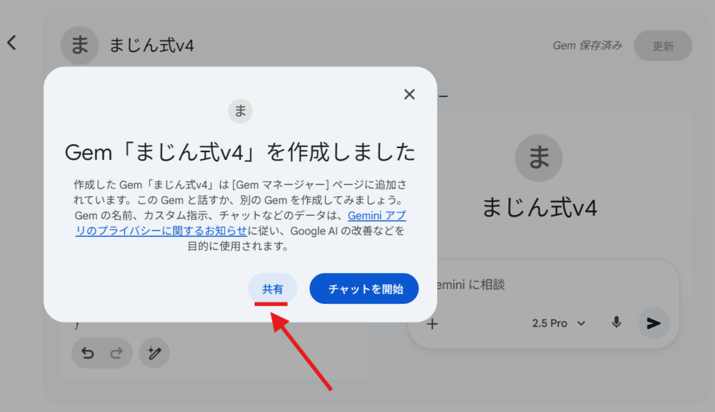 「保存」をクリックし、Gemが作成されたら「共有」から「リンクをコピー」を選択し、Gemのリンクをコピーします。