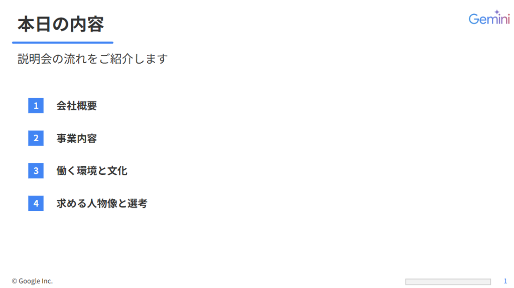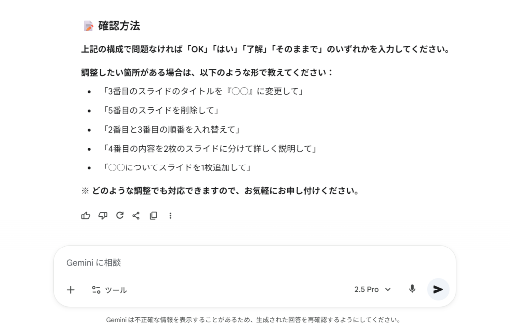 ↓プロンプト就活説明会にて使用する自社の紹介スライドを作りたいです。するとスライドの仕様確認と共に以下のような確認画面が出るので問題なければ「OK」「はい」「了解」「そのままで」のいずれかを入力します。