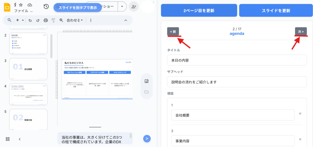 すると、左側のGoogleスライドに変更が反映されます。以下は今回の編集での変化前と変化後のスライドです。
