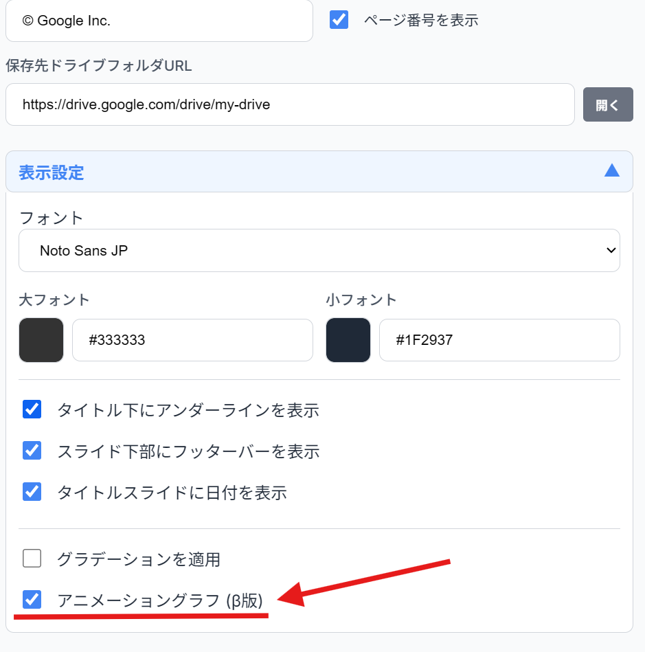 以下の編集画面の表示設定内にある「アニメーショングラフ」にチェックを入れて更新するとスライド内のグラフが動くようになります!