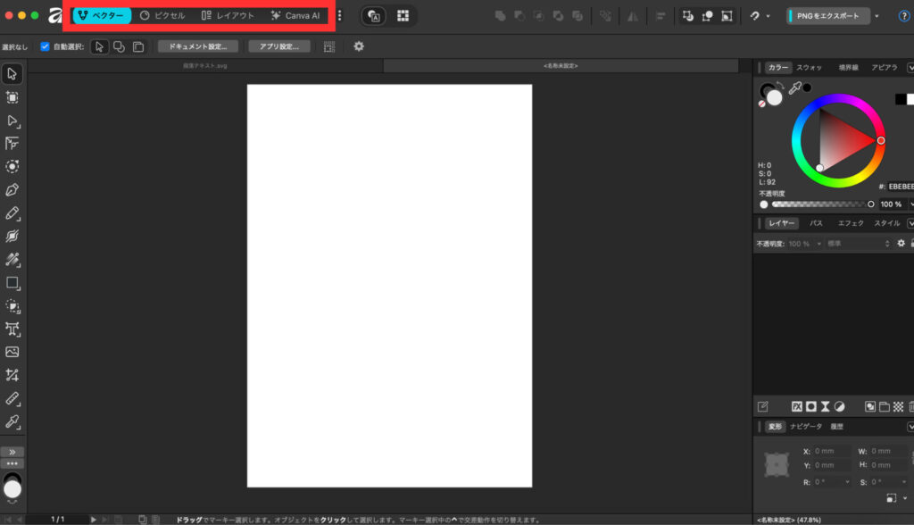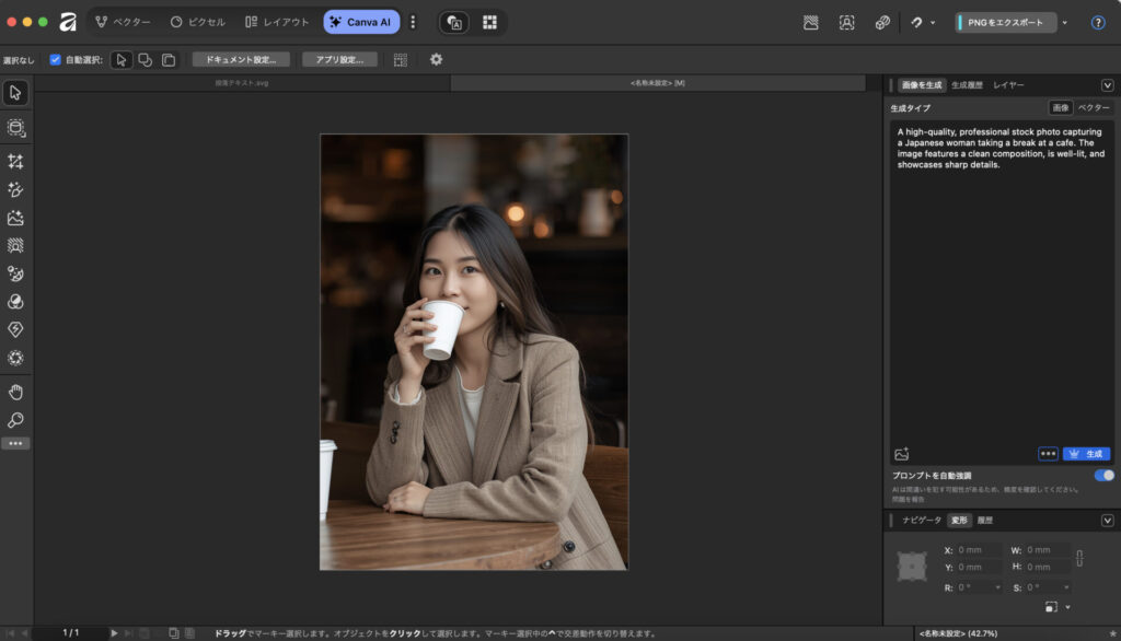 AffinityでAI機能を使用する方法は非常にシンプル。画面上部の「Canva AI」タブに切り替えるだけで利用できます。