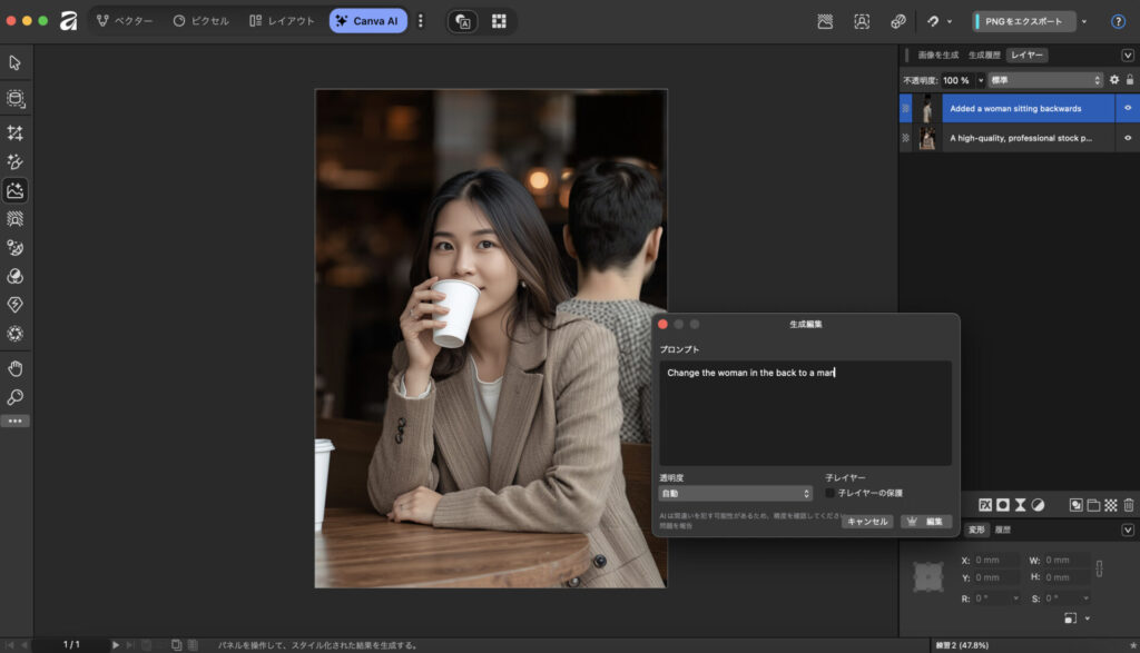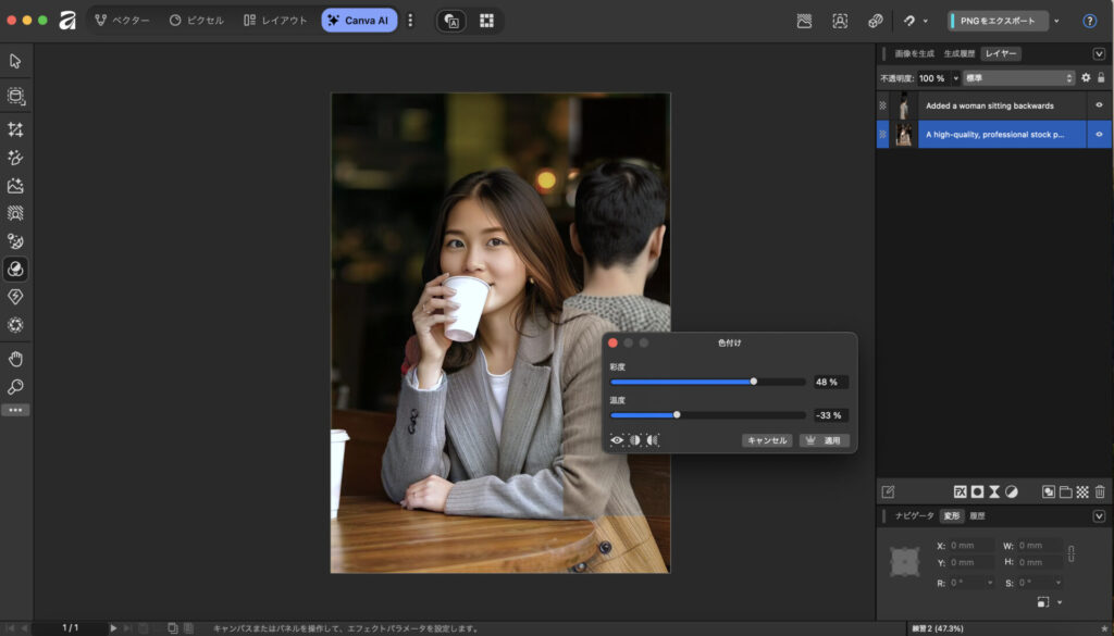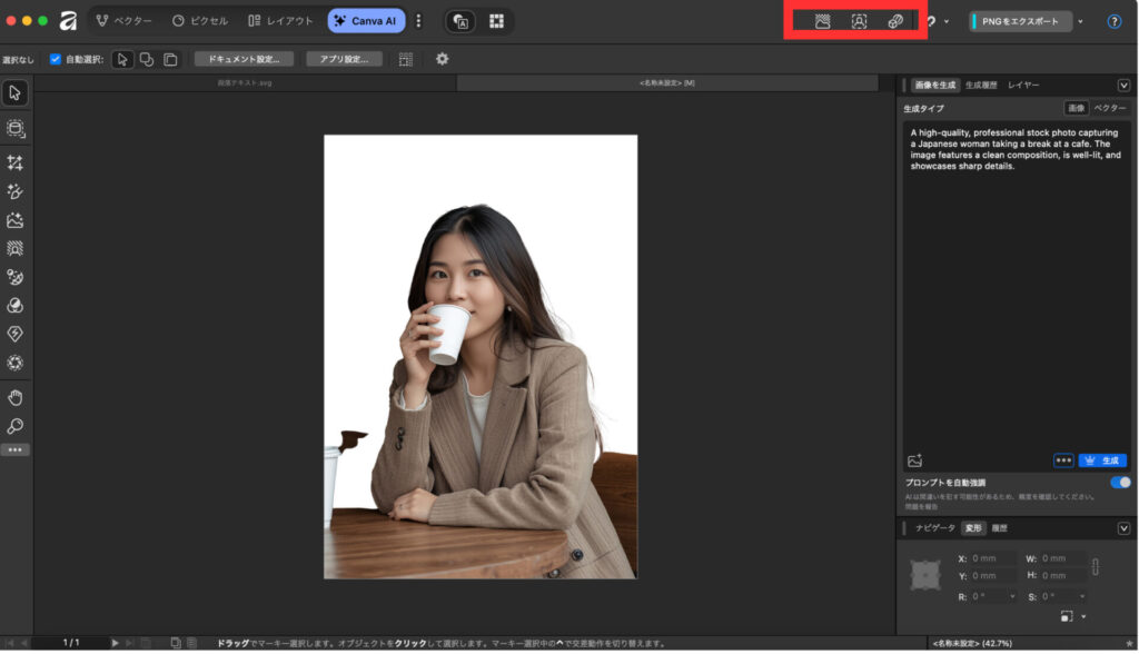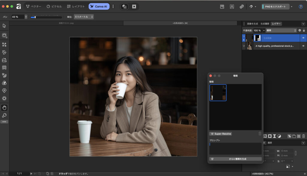 従来のAffinityツールとの切り替えもスムーズで、通常の編集作業とAI機能を組み合わせた効率的なワークフローを構築できる点は非常に大きなメリットです。