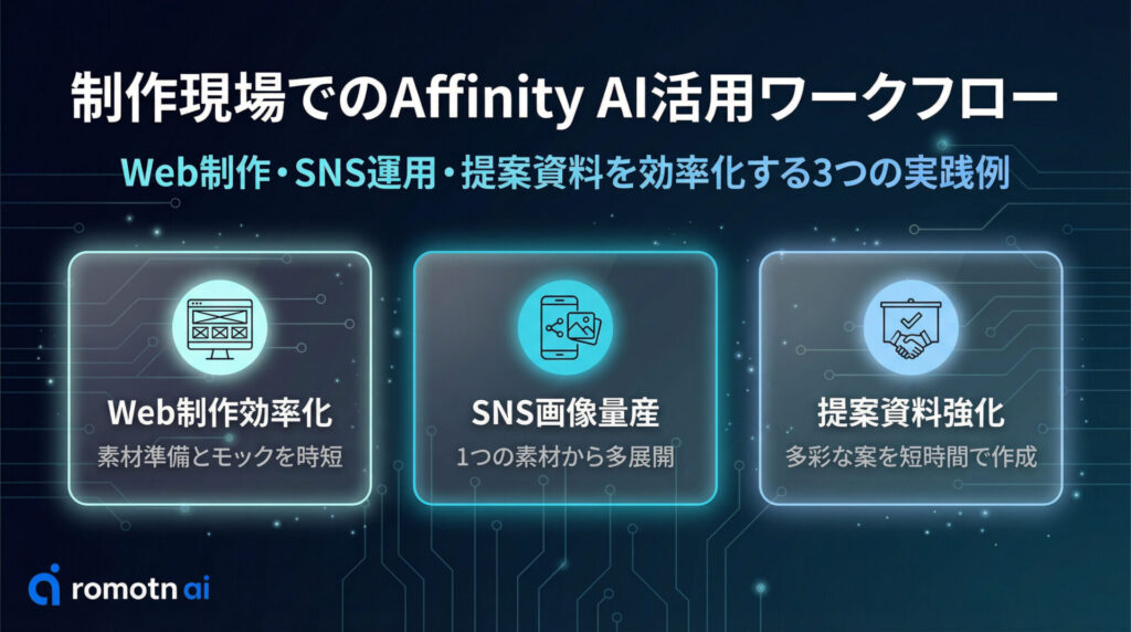 Webデザイン制作において、AffinityのAI機能は素材準備とモックアップ作成の時間を劇的に短縮します。具体的には下記の作業で役立ちます。
