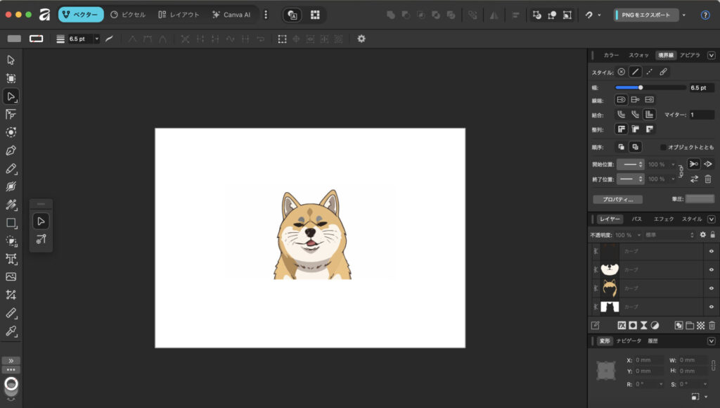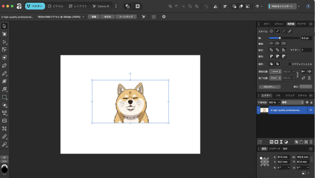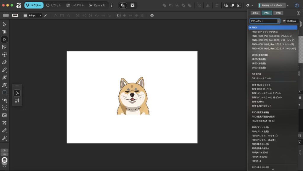 完成したベクターデザインを、用途に応じた形式で保存します。画面右上の「PNGをエクスポート」から書き出し形式を選択してください。SVG形式で書き出すと、ベクター化された画像が拡大しても劣化しない高品質なデータとして保存されます。