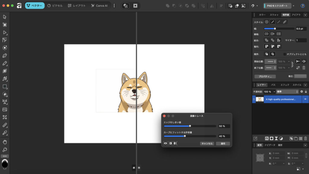 「エッジのしきい値」や「カーブにフィットする許容量」のスライダーを調整して、「適用」をクリックします。こちらでベクター化されたので、右下の「レイヤー」パネルでレイヤーを展開して不要なものを削除してください。