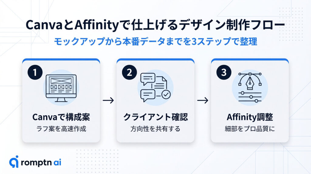 この戦略の利点は、企画段階での手戻りを最小化しつつ、最終成果物のクオリティを妥協しない点にあります。Canvaでの素早いイテレーションとAffinityでの精密な仕上げを組み合わせることで、スピードと品質を両立できます。