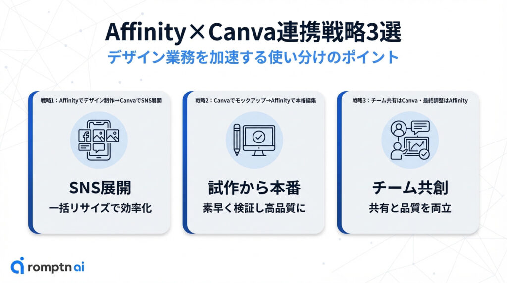 Affinity 3.0は精密なデザイン制作、Canvaは効率的な展開と共有に優れているため、この特性を活かした戦略的なワークフローを構築することで、デザイン業務全体の生産性が向上します。