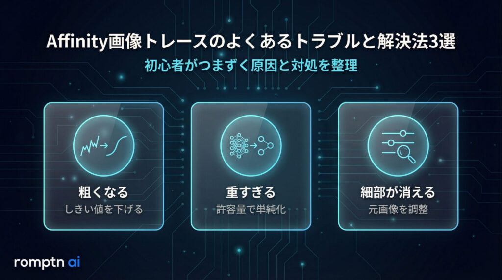 Affinityの画像トレースを使い始めると、思った通りの結果が得られないことがあります。ここでは初心者が特につまずきやすい3つのトラブルと、その解決法を紹介します。