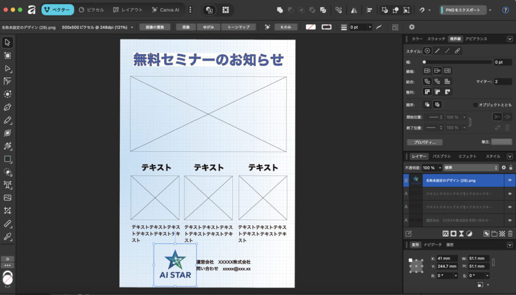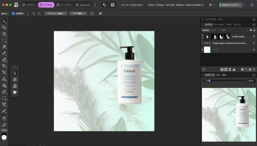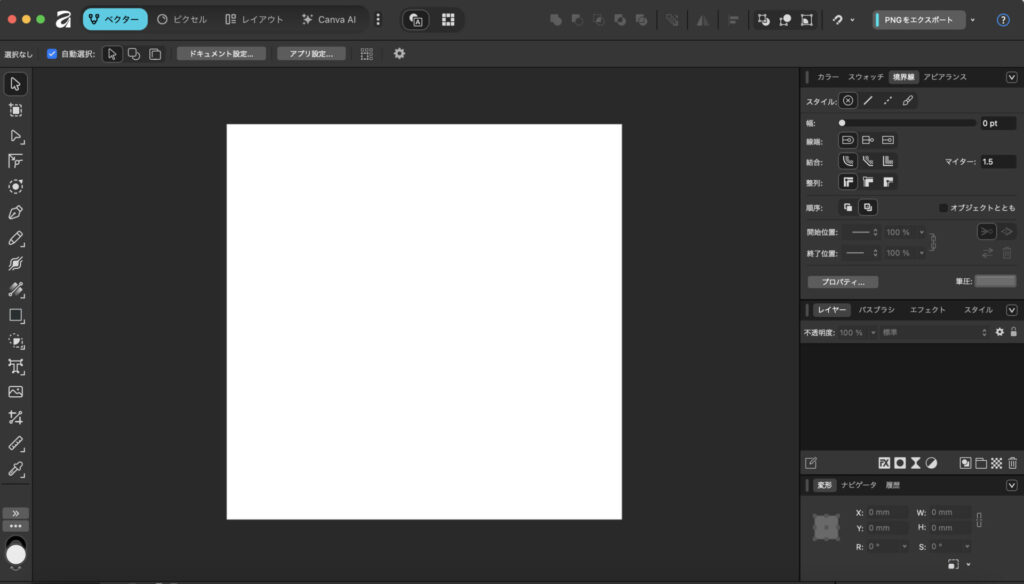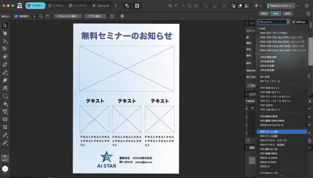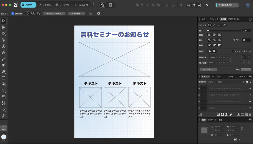 さらに、Canvaとの統合により、Canvaの豊富なテンプレートや素材も活用できるようになりました。Canvaで大まかなレイアウトを作成し、Affinityで細部を調整するという使い分けも可能です。テキストの装飾や配置もCanvaの直感的な操作性を活かしながら、より高度な編集が行えます。