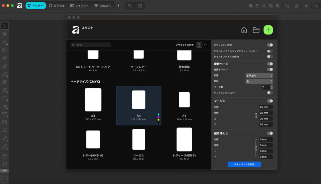 Affinityを起動し、「新規ドキュメント」を選択します。ドキュメントタイプから「印刷」を選び、プリセットから「A4」を選択するだけで、自動的に210×297mmのサイズが設定されます。