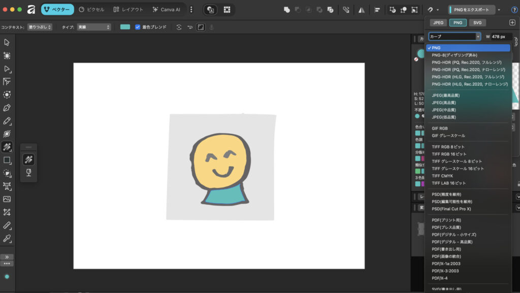最後に、完成したイラストやアイコンを、用途に応じた形式で書き出しましょう。