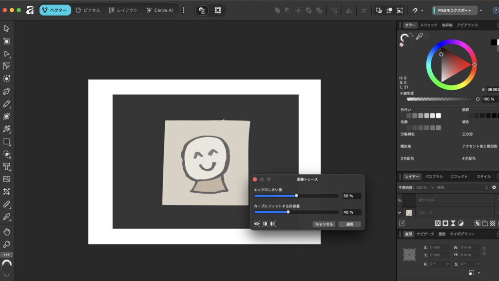 次に、ピクセルスタジオの「トレース」機能を使って手書き線をベクターデータに変換します。