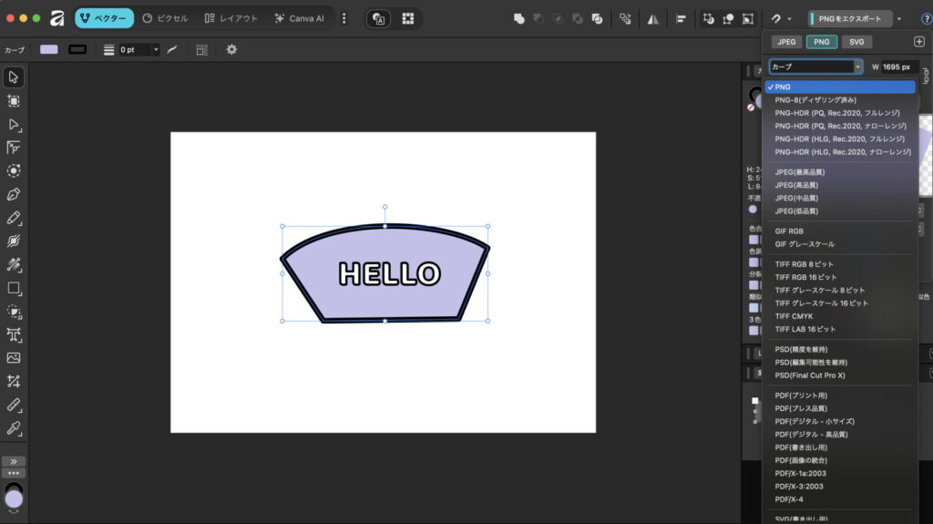 逆にAffinityからIllustrator形式での書き出しも可能です。 完全な互換性ではありませんが、基本的なベクターデータのやり取りは問題なく行えます。