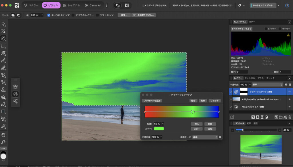 選択範囲を作成した状態で、右側の「調整」パネルから「グラデーションマップ」を選択。空と海を明るく鮮やかにする場合、左側(暗い部分)に濃い青や紺色、右側(明るい部分)に明るい水色や白を配置します。調整レイヤーとして追加されるため、いつでも調整や削除が可能です。