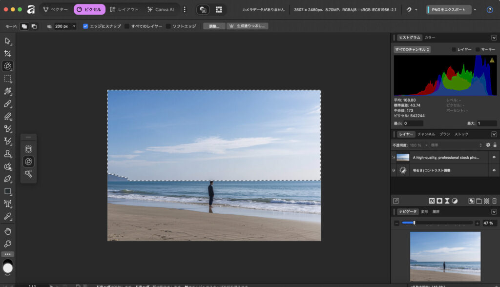 選択ブラシツールを使って、まずは空を選択します。空と海の境界線付近では小さめのブラシ(50〜100px程度)、広い範囲では大きめのブラシ(200〜500px程度)を使うと効率的です。
