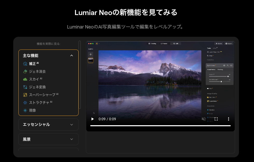 Luminar NeoはAI補正の自動化に優れており、風景写真のダイナミック補正や空の入れ替えなどが簡単に行えます。 生成塗りつぶしに近い機能として「Erase(消去)」や「GenExpand(背景拡張)」を搭載しており、特に風景・旅行写真の編集に強みを発揮します。