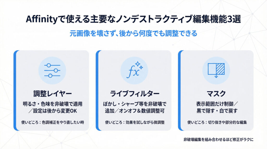 Affinityで非破壊的編集を実現する主要な機能をご紹介します。それぞれの特徴と使いどころを詳しく見ていきましょう。