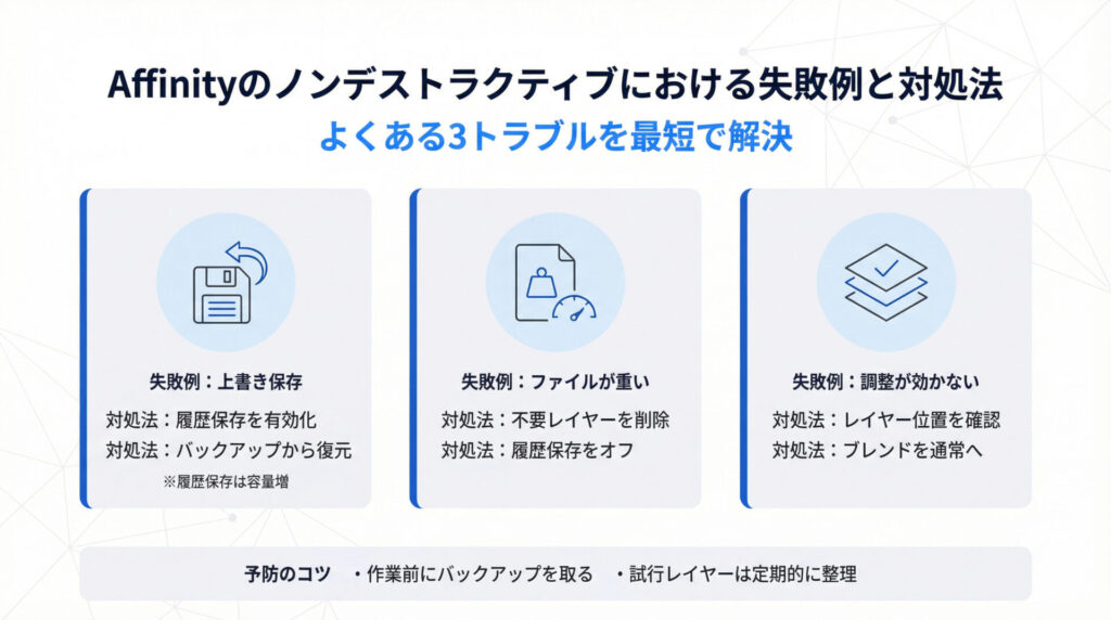 ここでは、よくある失敗例と、それぞれの対処法を紹介します。上書き保存してしまった場合や、ファイルが重くなりすぎた場合、調整レイヤーが効かない場合の具体的な解決策を見ていきましょう。