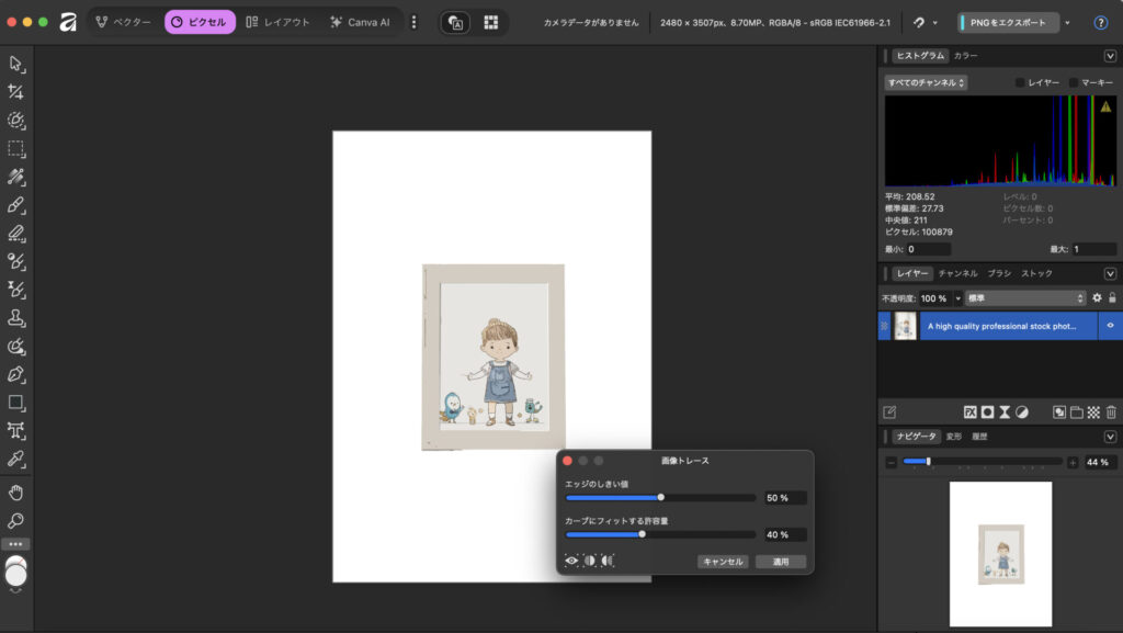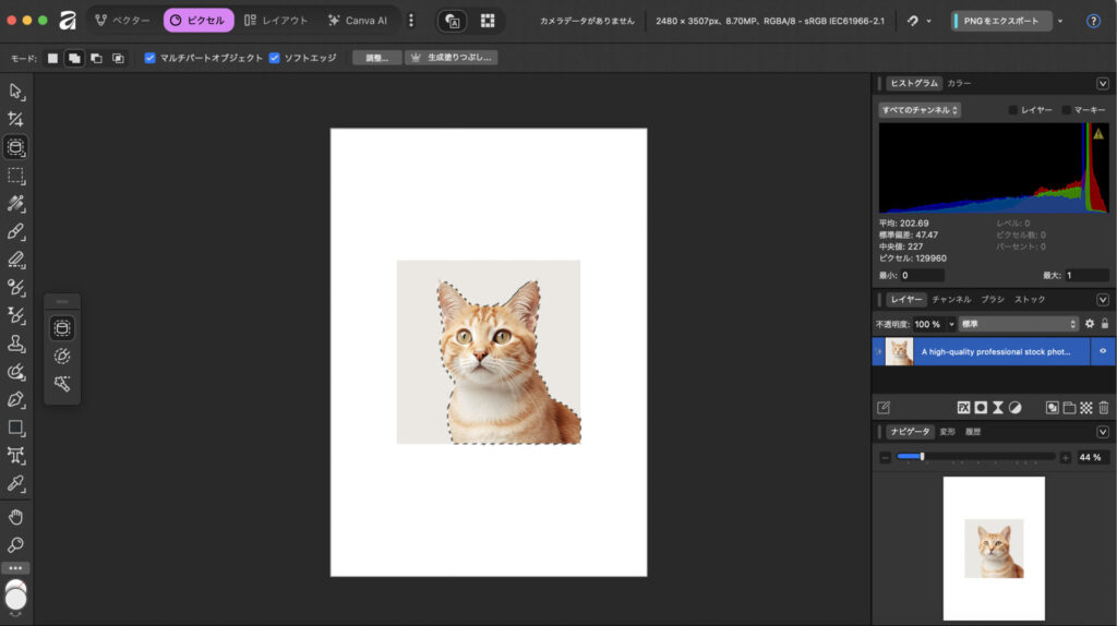 ピクセルスタジオに切り替え、切り抜きたい画像を開きます。左側のツールバーから「選択ブラシツール」を選択し、残したい対象物をなぞって選択範囲を作成します。細かい部分は拡大表示しながら丁寧に選択してください。