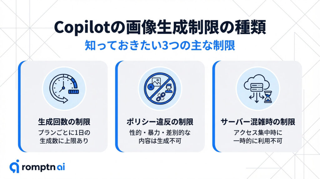 - Copilotの画像生成には回数制限をはじめ3つの制限がある