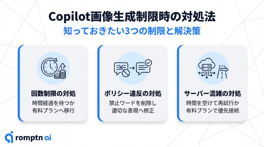 Copilotの画像生成で制限がかかった際の対処法はそれぞれ以下の通りです。