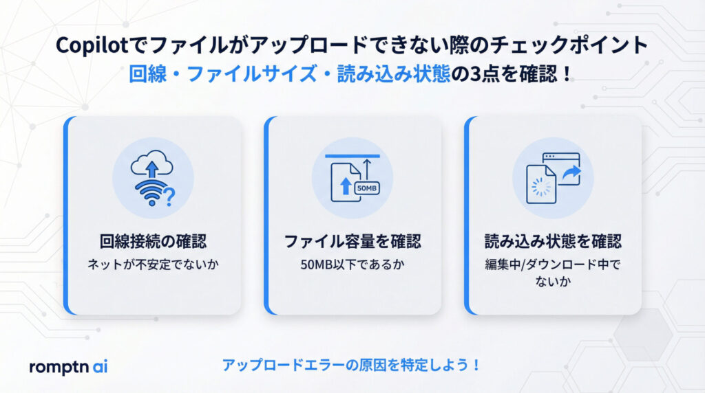 Copilotでファイルのアップロードができない場合、まず以下の3つのポイント確認してみてください。
