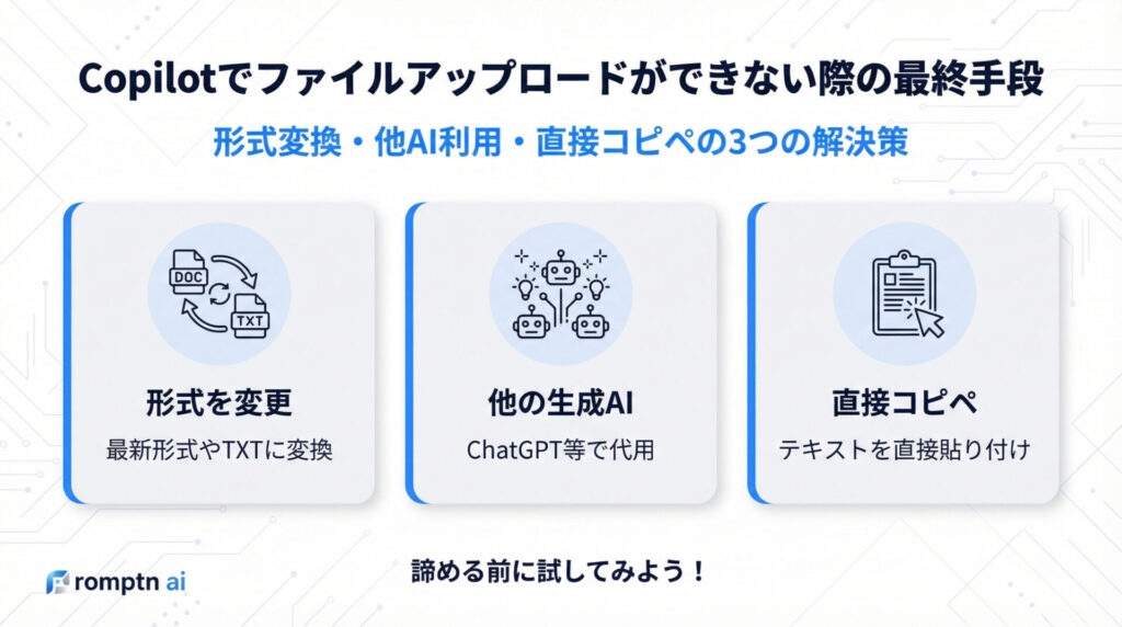 ここまで「Copilotでファイルアップロードができない際の対処法」や「ファイルアップロードができない際の最終手段」について解説してきました。