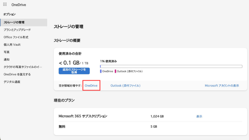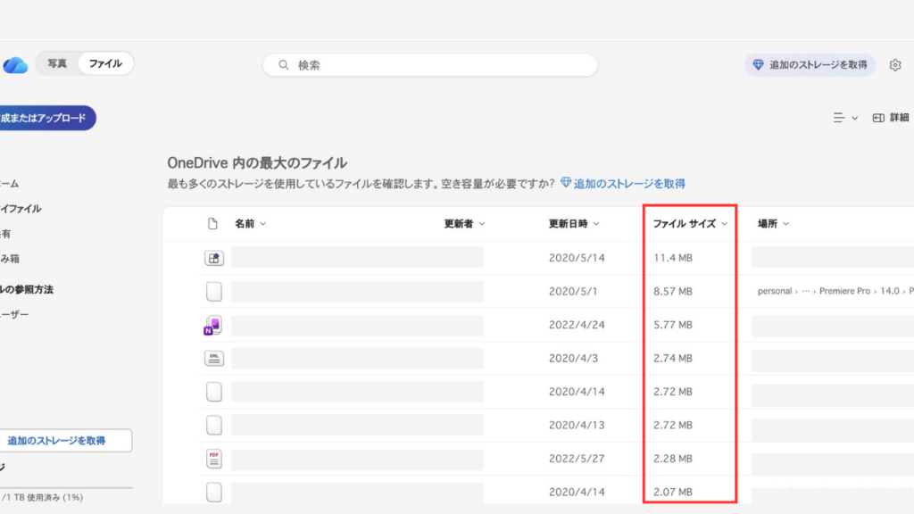 また、OneDrive上のファイルの容量は以下の手順で確認することができます。