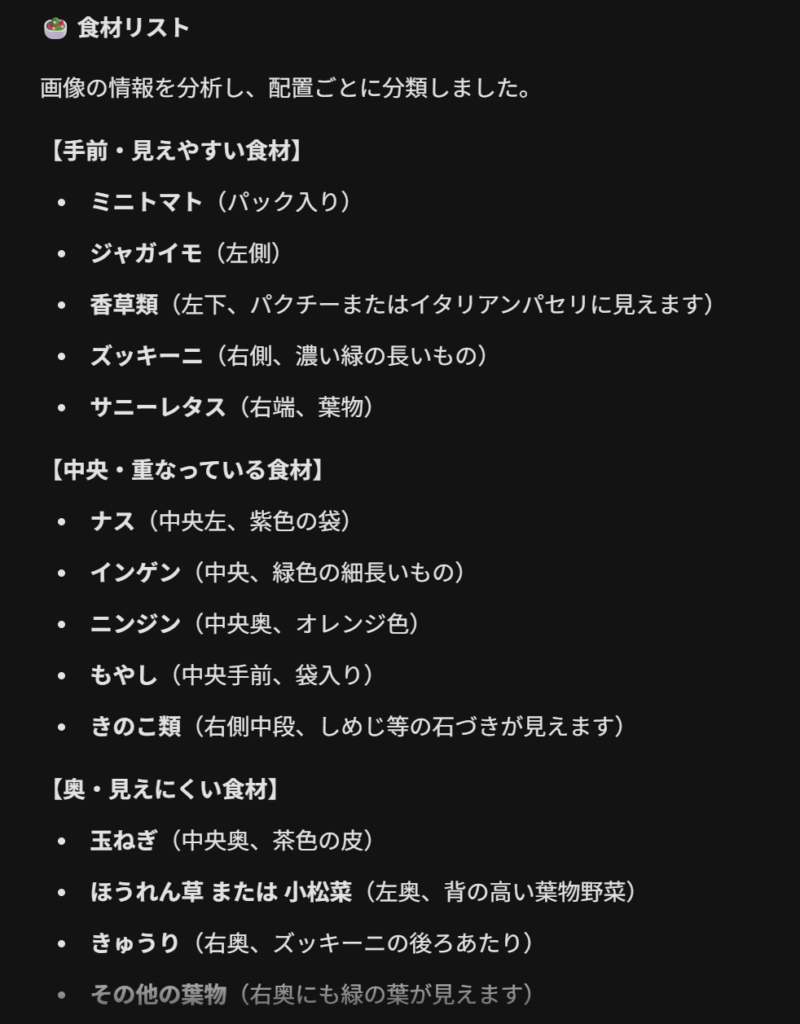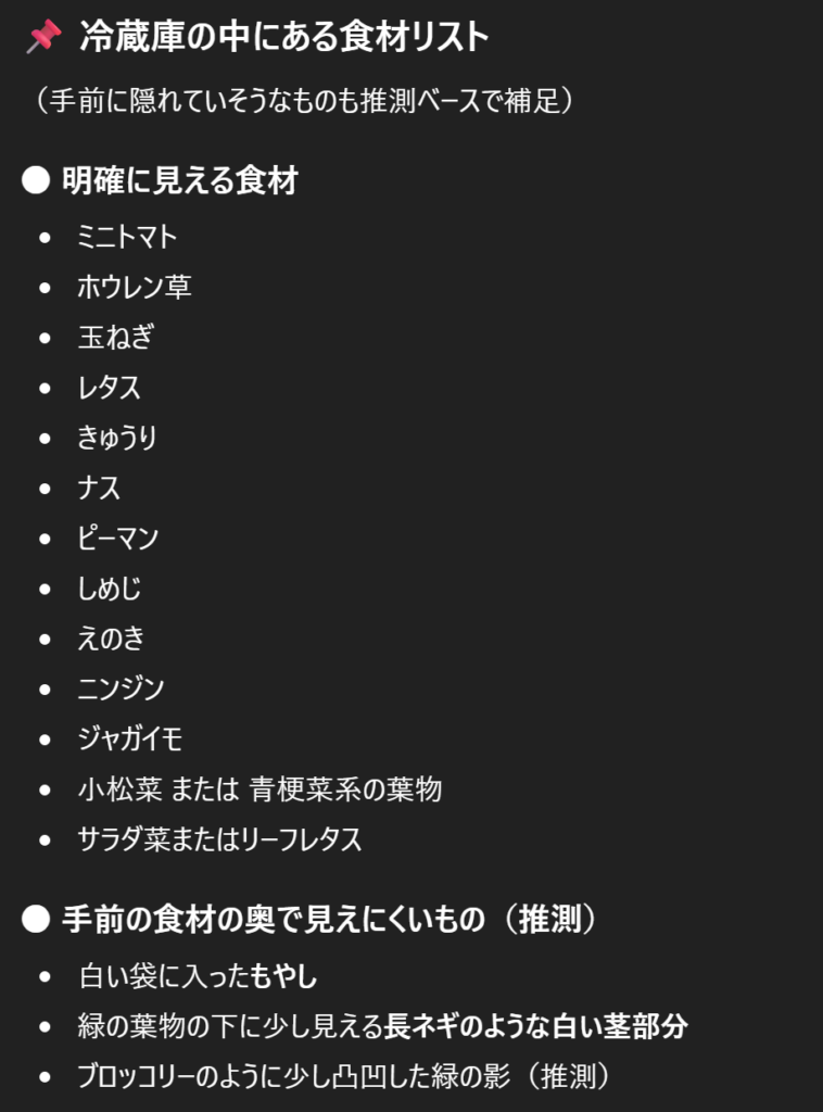 ChatGPTは、冷蔵庫奥の葉物の下に見える長ネギのような白い茎を認識できているという点ではGeminiに勝っていますが、全体的な正確性を見るとこの対決は「Gemini3.0」の勝利です。