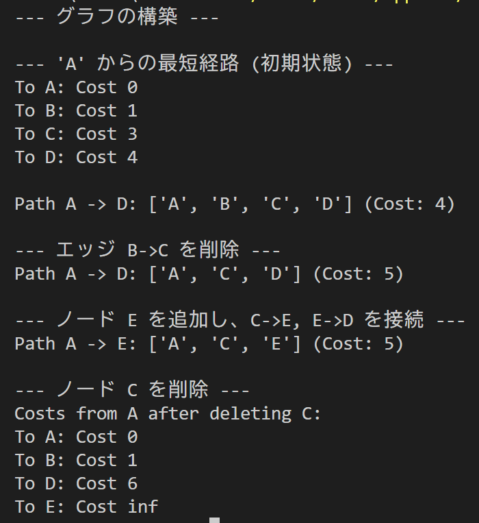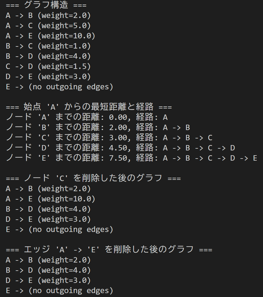 print("\n=== エッジ 'A' -> 'E' を削除した後のグラフ ===")