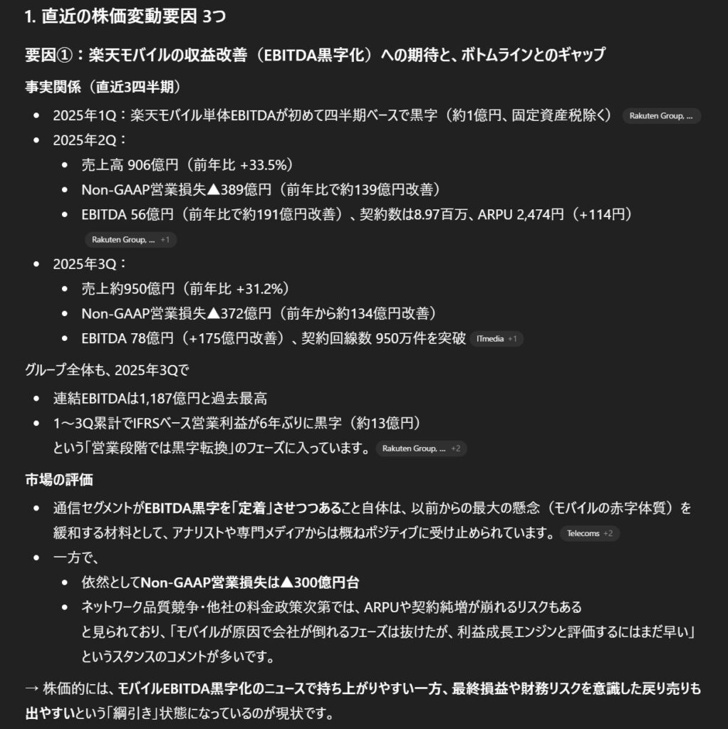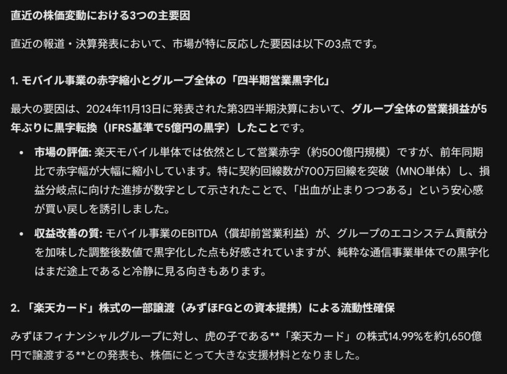 直近の報道を検索し、楽天グループ(4755)の株価が変動した主な要因を3つ特定してください。特に以下の2点に焦点を当てて分析してください。