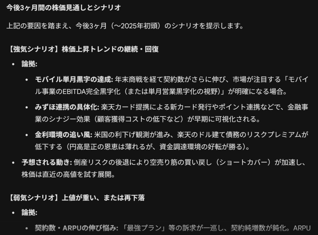これらの複合的な要因を考慮し、今後3ヶ月間の株価の見通しについて、それぞれの論拠を明確にした強気シナリオと弱気シナリオを立案してください。