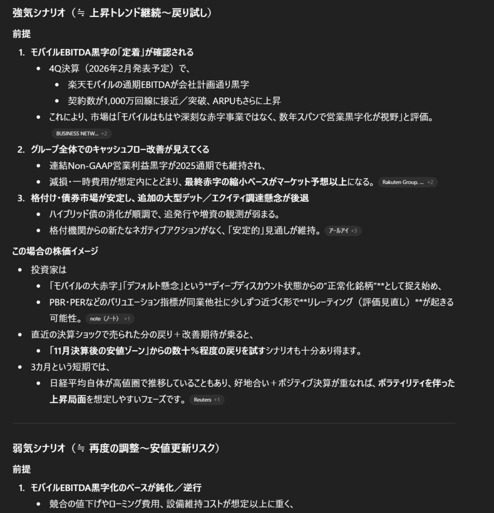 1.楽天モバイル事業の最新の収益改善状況に対する市場の評価。