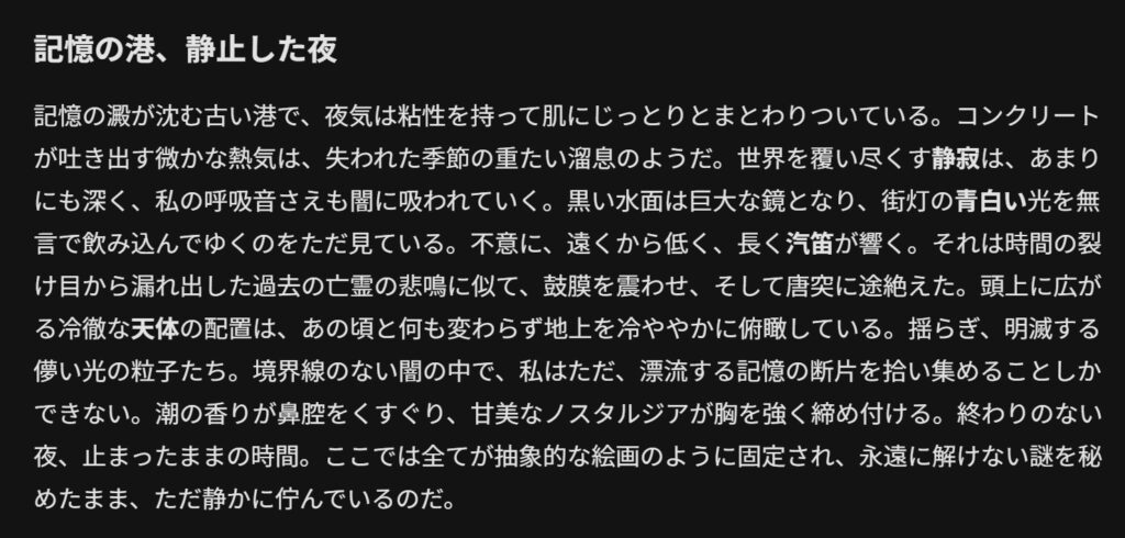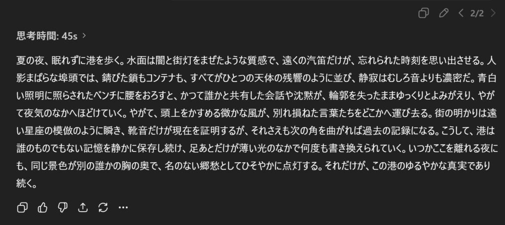 両者ともに、必須単語や禁止単語、ノスタルジックで抽象的なトーンを守った出力をしてくれました。どちらのポエムもそれぞれ良さがありますが、Geminiは語数が414字で制約を守れなかったので400字ピッタリで出力してくれた「ChatGPT5.1」の勝利です。
