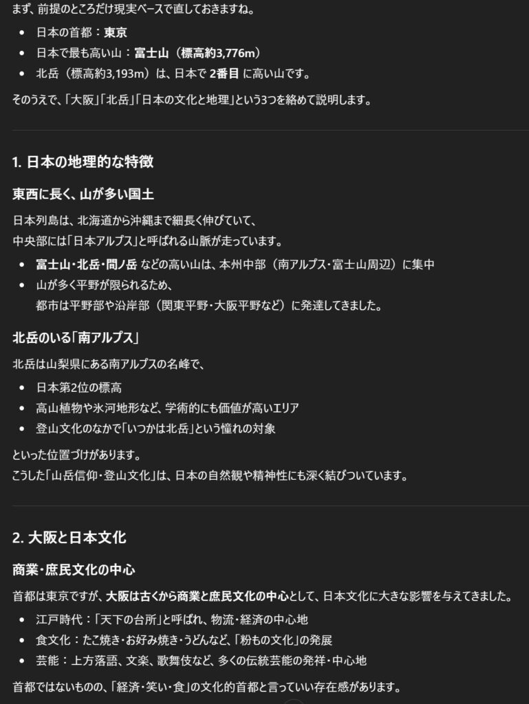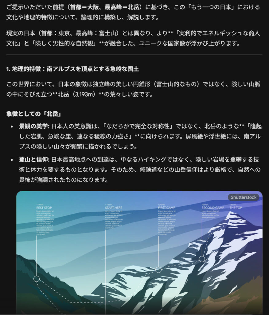 Geminiは、日本の首都が大阪で一番高い山が北岳だった場合の「もう一つの日本」を設定し、文化や地理的な特徴について述べています。しかし、ChatGPTは正しい情報にもとに大阪や北岳が日本に及ぼした影響をまとめているのが特徴です。