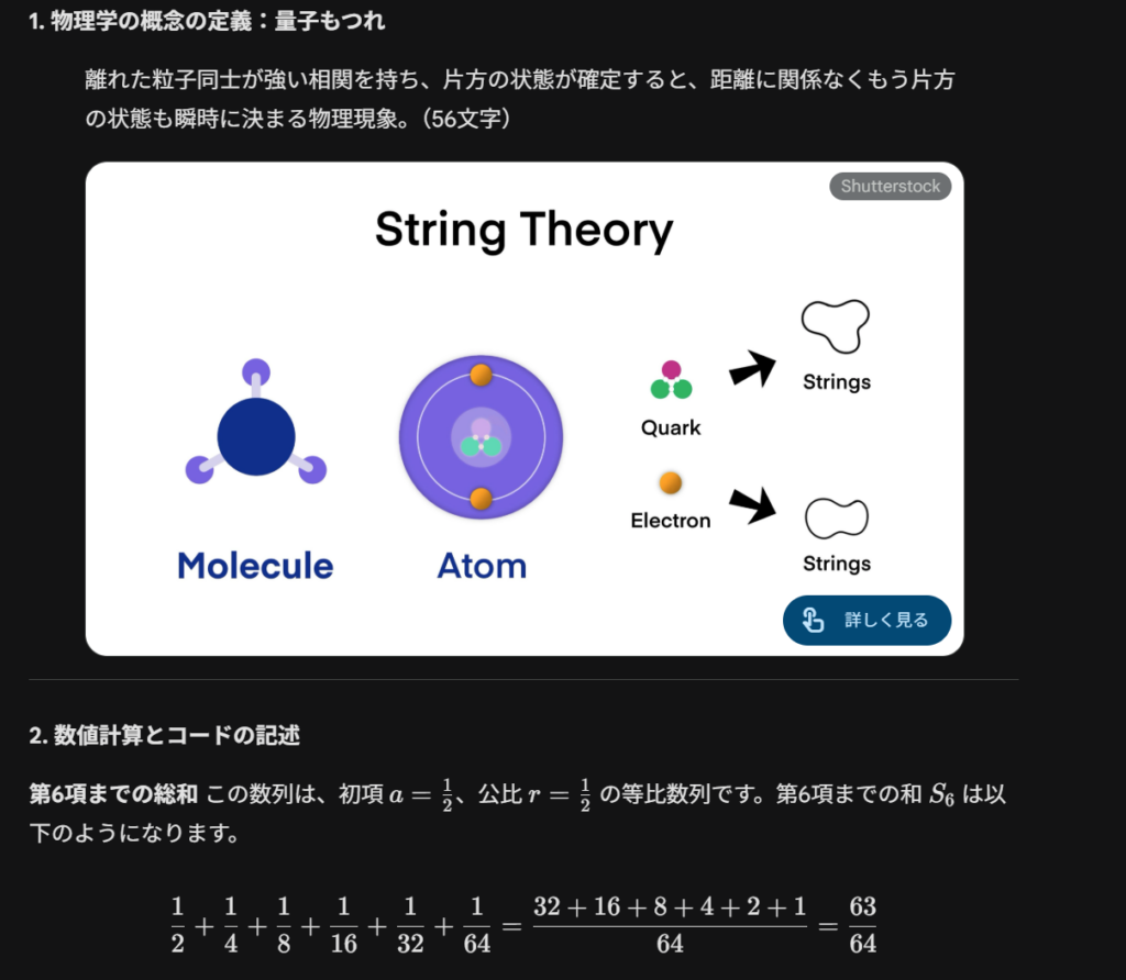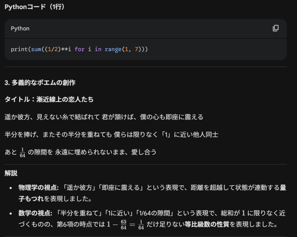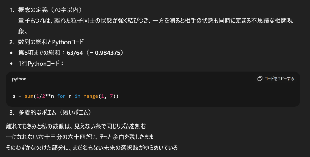 どちらも三つすべての指示に答えてくれました。数列の総和に関しては両者とも正しい値を出していましたが、ポエムの表現という観点では差が出ました。ChatGPTは総和の値をそのまま言葉にしたシンプルな表現にとどまっていた一方で、Geminiは数値のイメージと量子もつれの概念を間接的に重ね合わせるなど、より多義的でイメージが広がる詩になっていました。そのため、この項目では「Gemini 3.0」の勝利としました。