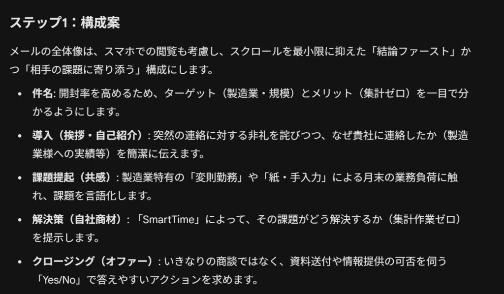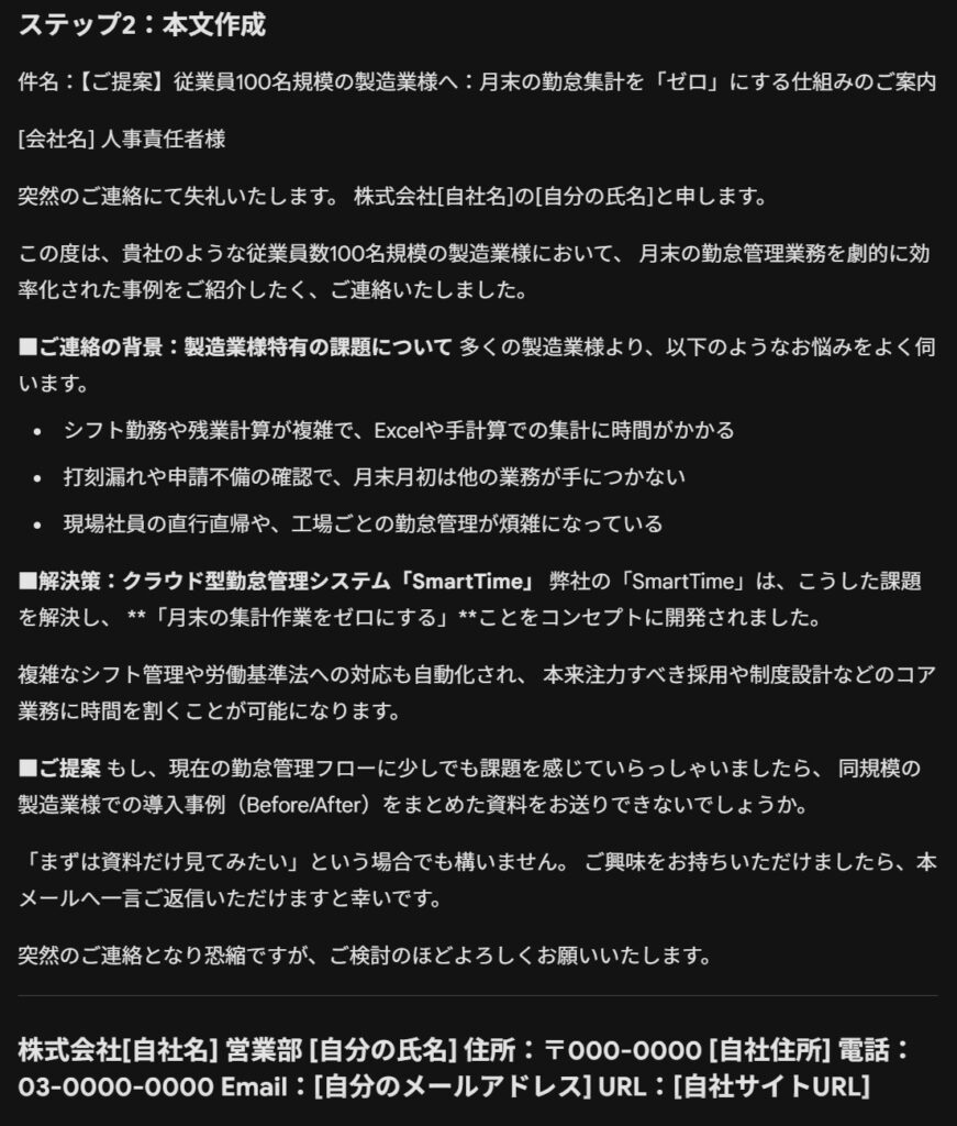 ステップ1の構成に基づき、そのまま送信可能なレベルのメール本文を作成してください。